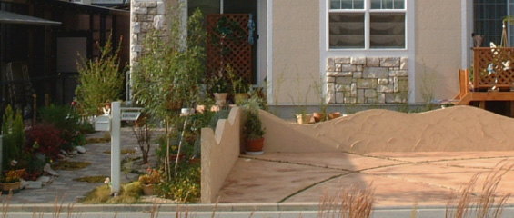 直線的な塀と曲線的な花壇配置の対比がステキな玄関アプローチです。